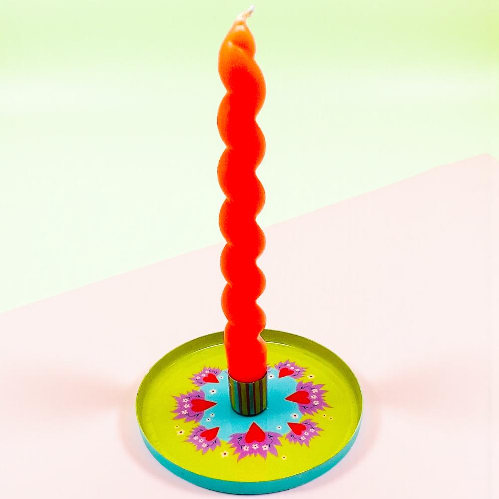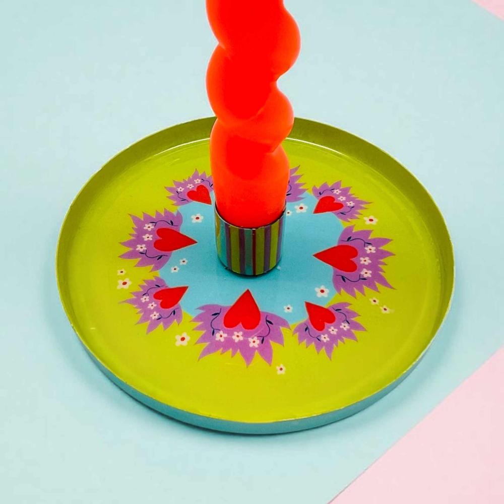 Ein saftiges Lemon-Gelb und ein zauberhafter Print mit Herzdesign lockt den Blick und weckt positive Gedanken! So eignet sich dieser Kerzenhalter aus stabilem Metall für jede Kerzenfarbe- und form, denn der Kerzenhalter selbst ist so ansprechend! Erfrische damit eine Tischdeko oder setze ein Highlight damit auf einem Sideboard.
