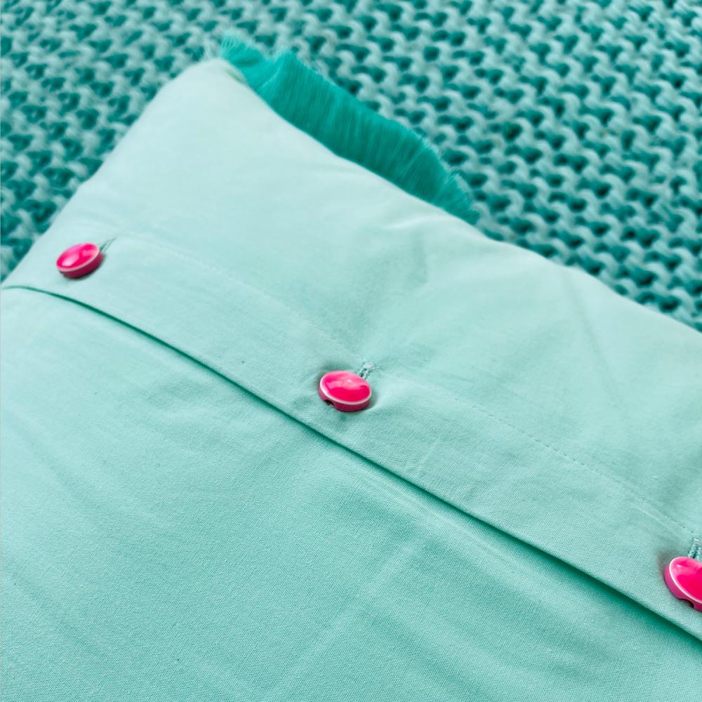 Die Rückseite ist in unifarbenem Baumwollstoff in pink gehalten. Ausgewählte Knöpfe dienen als Verschluss.