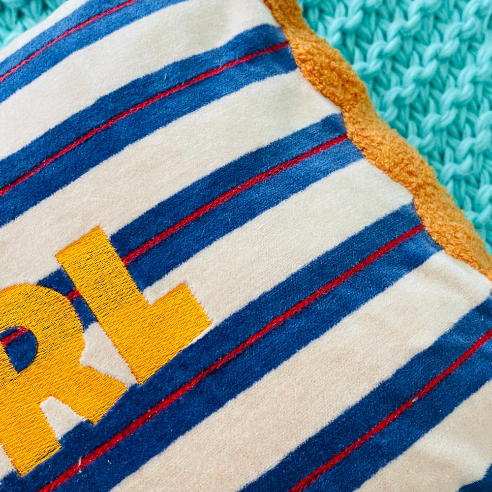 Das Kissen PINSTRIPE Supergirl vereint einen fast klassischen Streifen mit dem liebevollen Wort: SUPERGIRL- nimm es persönlich und erfreue dich daran!!!