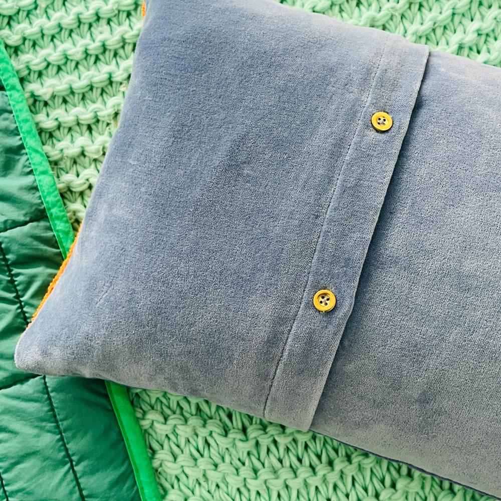 Leg das Kissen auf deine Couch und du hast ein hochwertiges weiches Accessoire, das für eine frische Note in deinem Zuhause sorgt. Du wirst sehen- an dieses Kissen lehnst du dich gerne. Denn das Kissen ist komplett aus Samt gefertigt- es ist auf der Vorderseite sowohl bestickt als auch bedruckt, auf der Rückseite ist es glänzend unifarben und wird mit Knöpfen geschlossen.