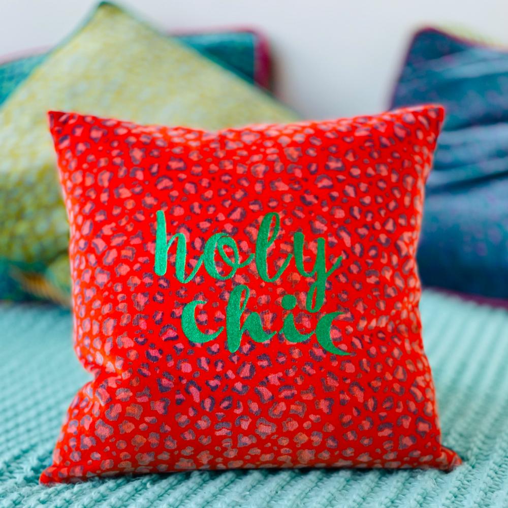 Holy shit- oh Verzeihung- wir meinen natürlich holy CHIC! Denn chic ist das hübsche Samtkissen allemal in seinem farbenfrohen Leopardprint mit der knalligen Aufschrift- HOLY CHIC!