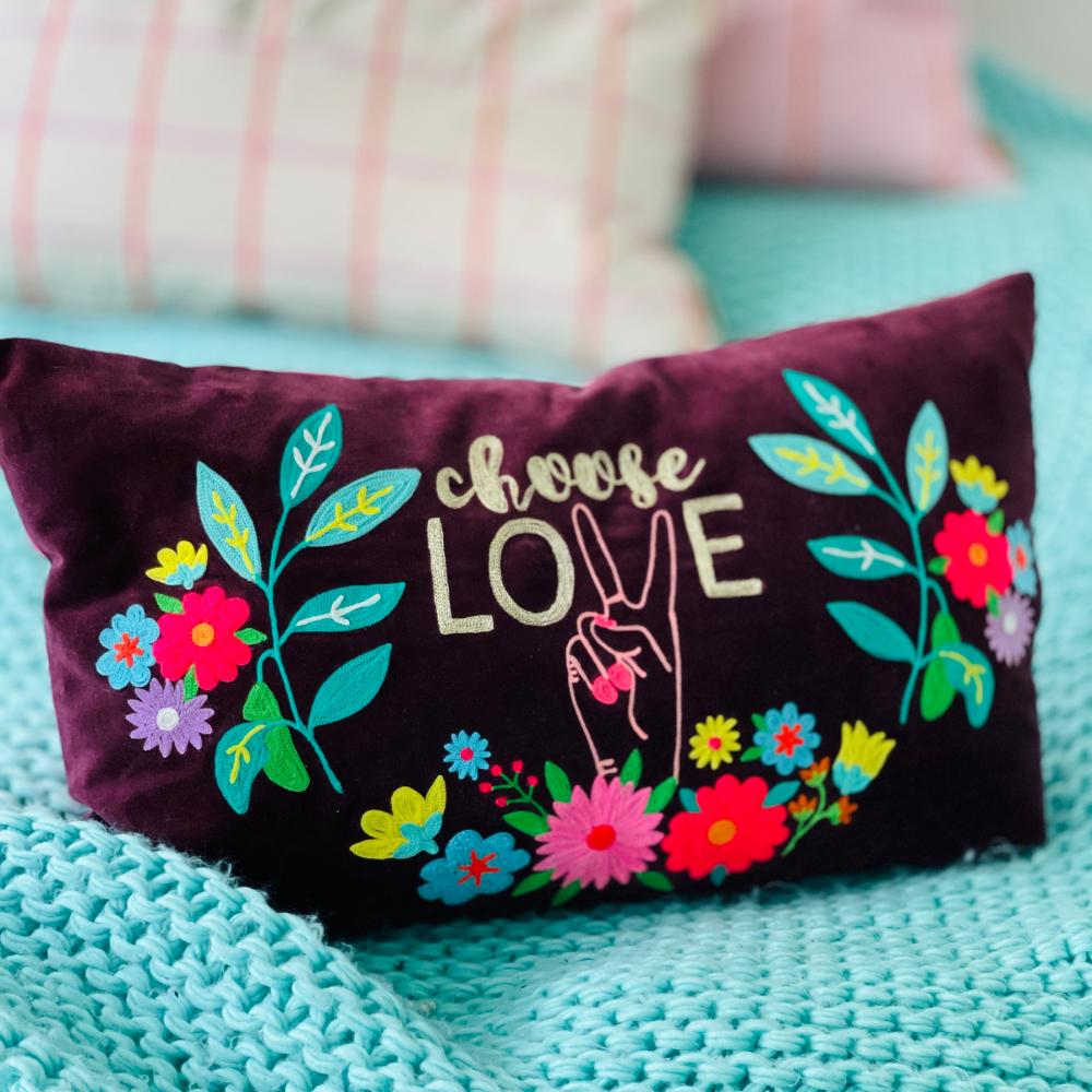 Mit diesem feinen plumfarbenen Samtkissen ist das gar nicht so schwer! Der dunkle volle Beerenton stimmt dich sanftmütig, die bunten Blumen und der Victory Gruß zeigen dir, daß das Leben bunt und positiv sein kann. Also lass dich auf dieses weiche einladende Kissen fallen, genieße jede Minute und sei liebevoll zu dir und anderen- choose Love!