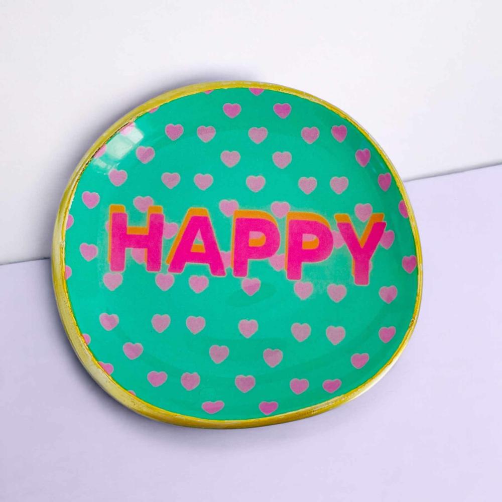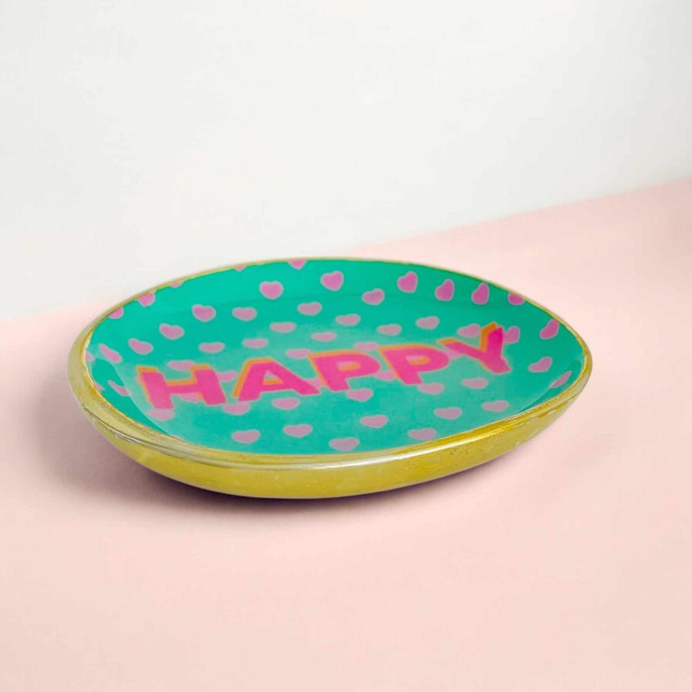 Mit einem Durchmesser von 9,5 cm bietet es viel Platz für deine Ringe, Ketten und anderen Schmuck, oder du schmückst mit der Schale ein Sideboard und immer, wenn du darauf blickst, wirst du daran erinnert- Happy zu sein!
