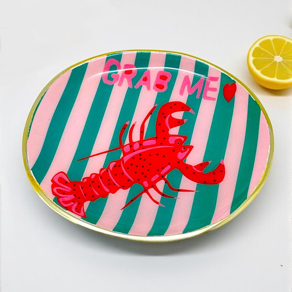 Die Schale hat alles, was wir gerne mögen- vom Lobster über einen farbenfrohen Streifen und dazu noch ein edler Goldrand- wow, diese Schale zieht den Blick an und begeistert! Dabei dient sie z.B. als Tellerchen für Ablagen am gedeckten Tisch genauso wie als hübsche Ringschale auf deinem Nachttisch. Denn mit einem Durchmesser von ca 12 cm bietet es viel Platz für deine Ringe, Ketten und anderen Schmuck.