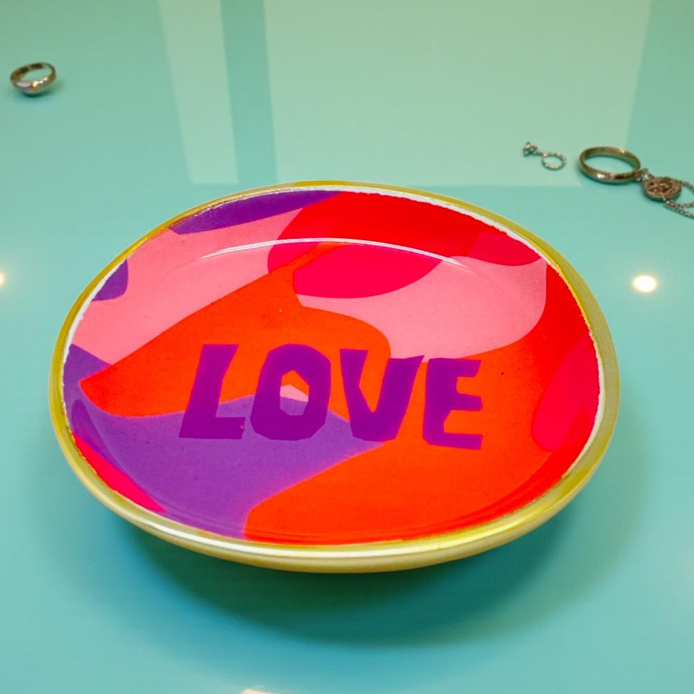 Wo die Liebe hinfällt... in dem Falle geht es um eine feine Schale aus Aluminium, die mit einem wunderschönen LOVE auf orange-pinkem Untergrund bedruckt ist. Da ist sie also- die Liebe! Ein besonderer Ring, ein kleiner Glücksbringer oder ein Token der Liebe, fühlen sich darin sicherlich sehr wohl! Genauso gut kannst du die Schale zu Tisch verwenden- ein paar Zitronenscheiben, ein wenig frische Kräuter darin- und du hast ein nützliches Dekoelement auf dem Tisch!