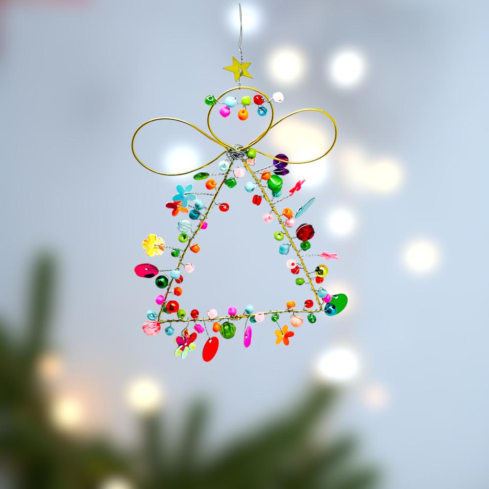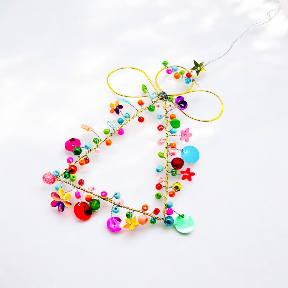 Dieser charmante Engel verzaubert durch seine kunstvolle Gestaltung- jede Perle und Paillette ist sorgfältig um den goldfarbenen Draht gewickelt, wobei eine kunterbunte Farbigkeit erreicht wird.