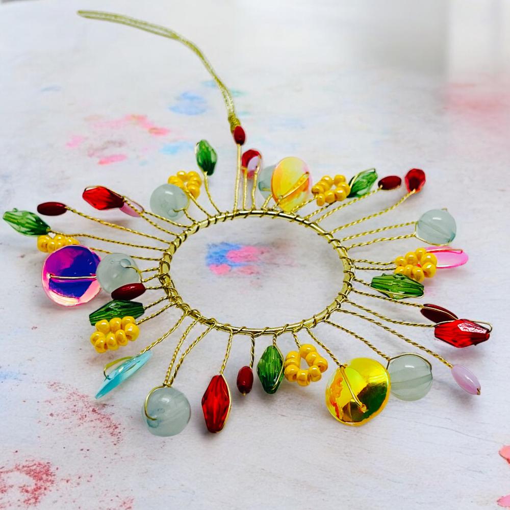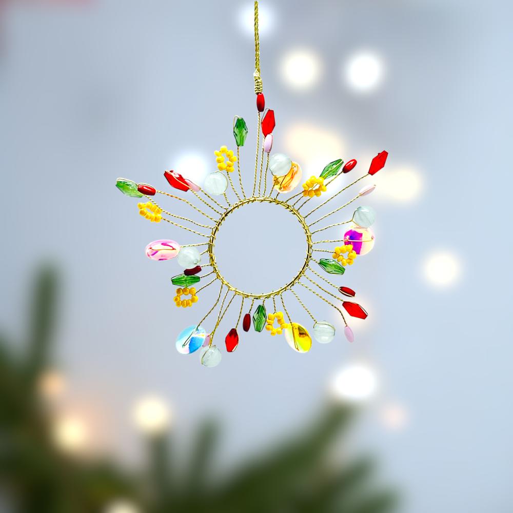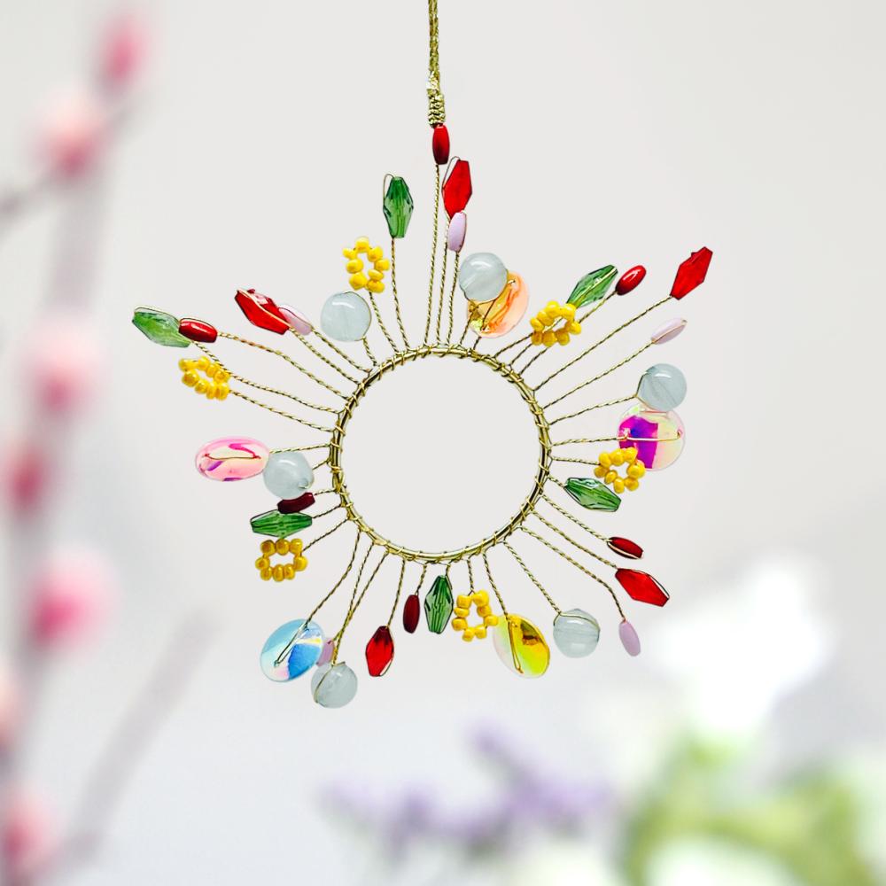 Die Dekoration Starflower multi strahlt in wunderschönen Gelb- und Orangetönen und zaubert dadurch eine fröhliche Stimmung in deinen Raum! Dekoriere damit einen Strauch, schmücke ein Fenster oder hänge sie an deinen Weihnachtsbaum. Sie ist so kunstvoll gestaltet und schimmert so schön, daß sie ein eindrucksvoller kleiner Hingucker ist! Denn jede einzelne Perle und jede Paillette ist einzeln ausgesucht und fachmännisch von Hand an dem feinen Draht gefestigt- eine Handarbeit, die viel Feingefühl erfordert. Und das sieht man dem Anhänger auch an- sie ist ein zauberhaftes, farbenfrohes kleines Mitbringsel für festliche Anlässe wie Geburtstage oder auch das Weihnachtsfest!