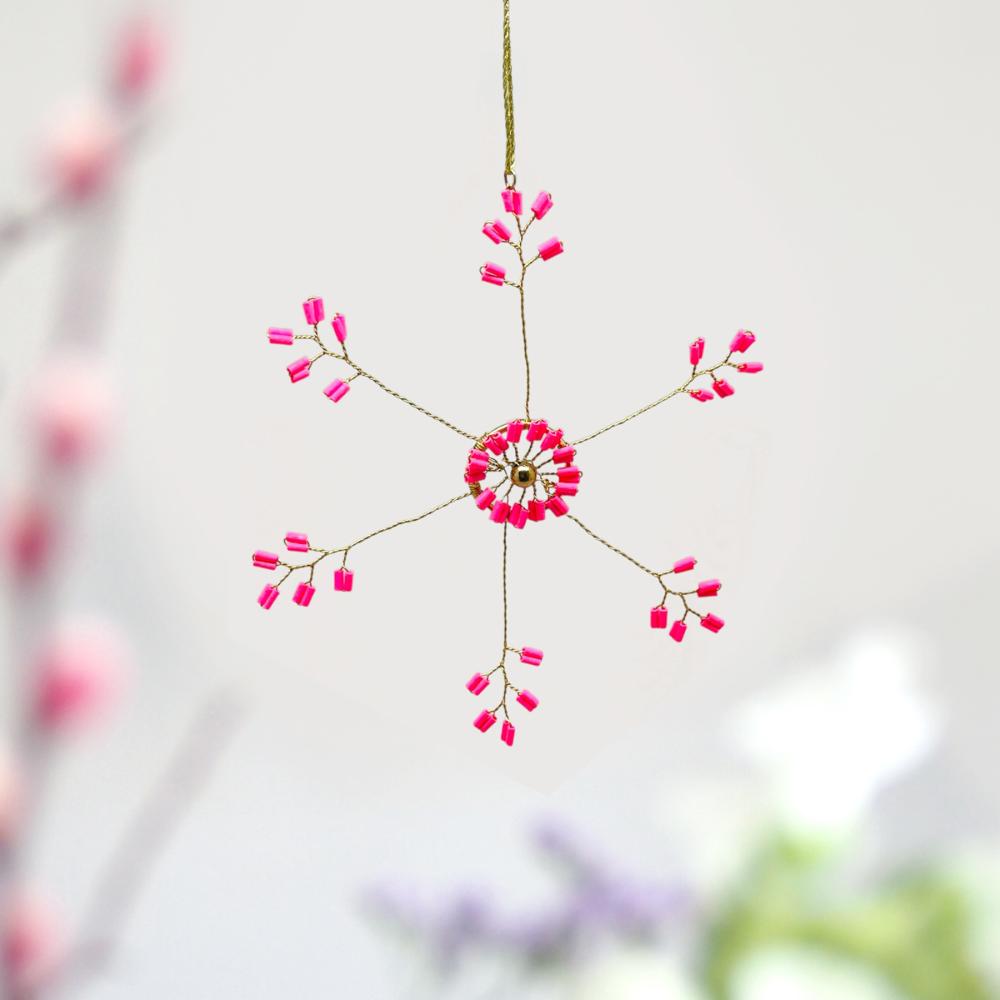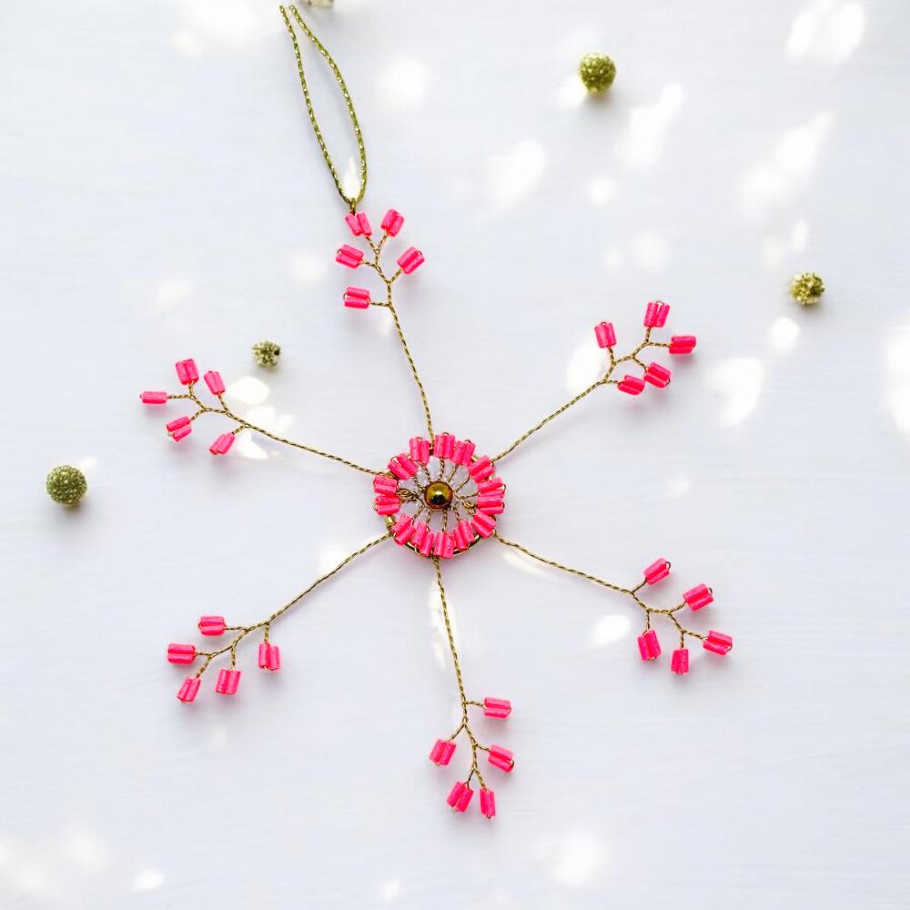 Das filigrane Design der Starflower Dekoration formt so ein bezauberndes ultrafeines Muster! Kaum zu glauben, daß dieser Anhänger von Hand so gleichmäßig geformt wurde- feinfühlig und sorgsam sind die leuchtenden Perlchen aneinandergereiht und aufgefädelt. Das ist ein echtes kleines Kunstwerk- ein Schmuckstück, das sowohl einen Weihnachtsbaum aufpeppt als auch als Ornament auf einem festlichen Tisch große Aufmerksamkeit auf sich zieht!