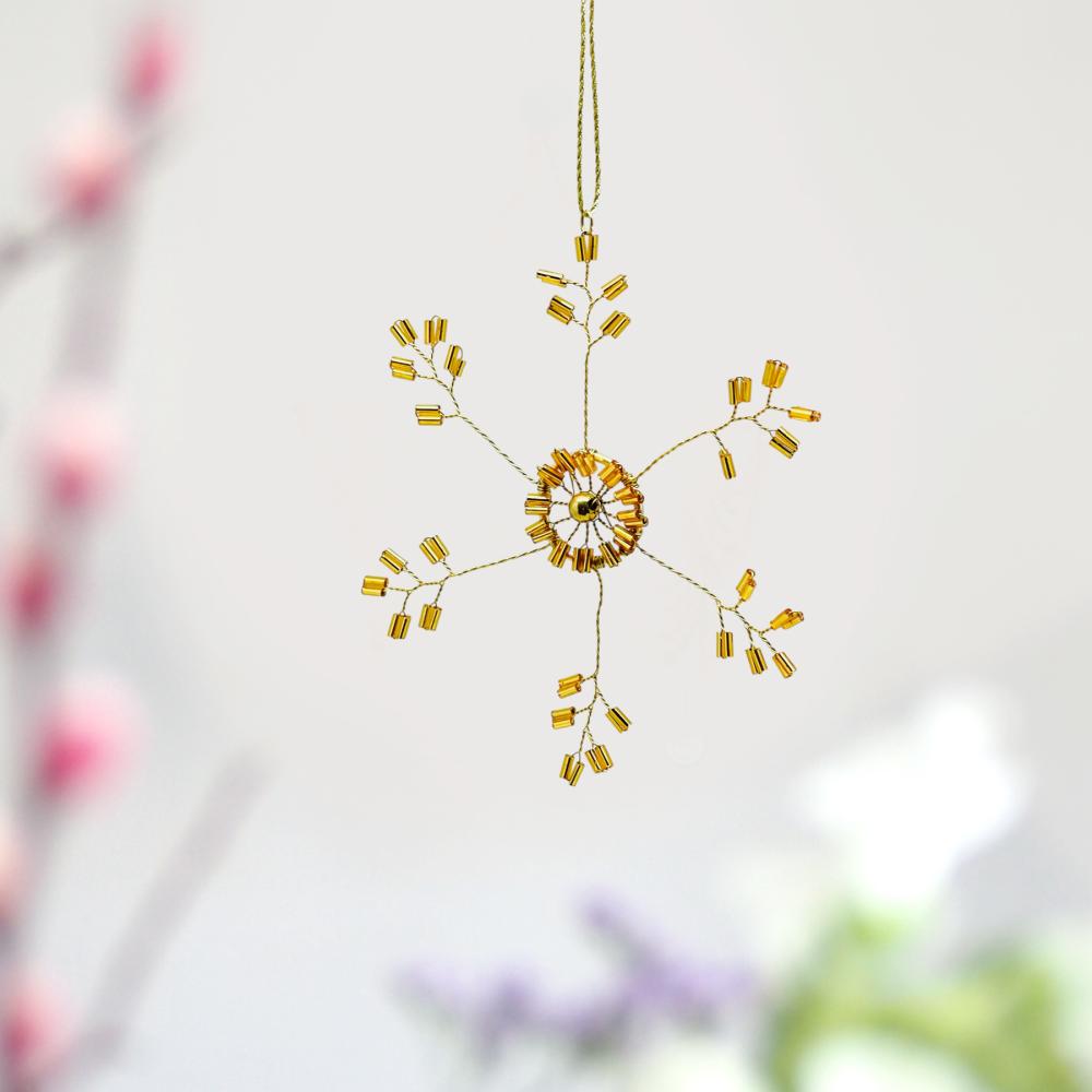 Das filigrane Design der Starflower Dekoration formt so ein bezauberndes ultrafeines Muster! Kaum zu glauben, daß dieser Anhänger von Hand so gleichmäßig geformt wurde- feinfühlig und sorgsam sind die goldfarbenen Perlchen aneinandergereiht und aufgefädelt. Das ist ein echtes kleines Kunstwerk- ein Schmuckstück, das sowohl einen Weihnachtsbaum aufpeppt als auch als Ornament auf einem festlichen Tisch große Aufmerksamkeit auf sich zieht!