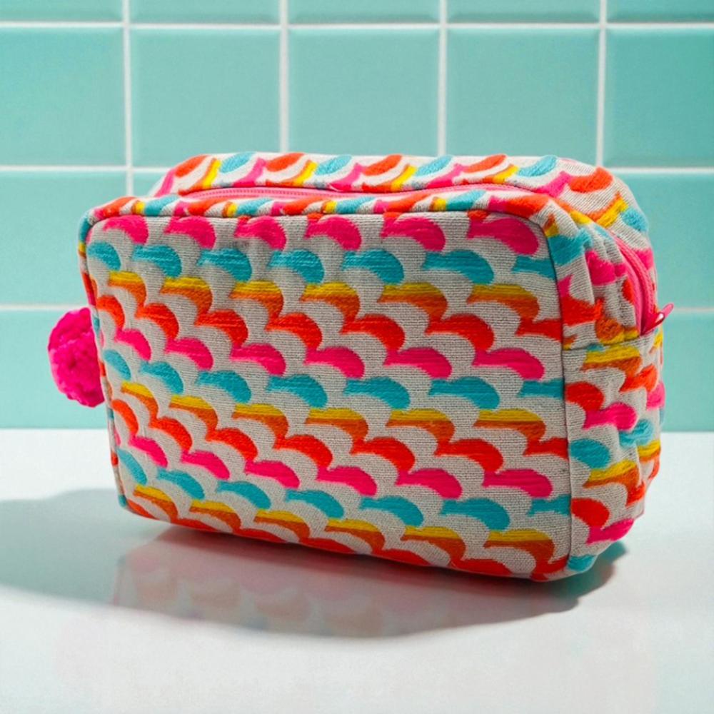 Das Täschchen schließt mit einem Reißverschluss. Auch die Rückseite ist in dem Webstoff gehalten.