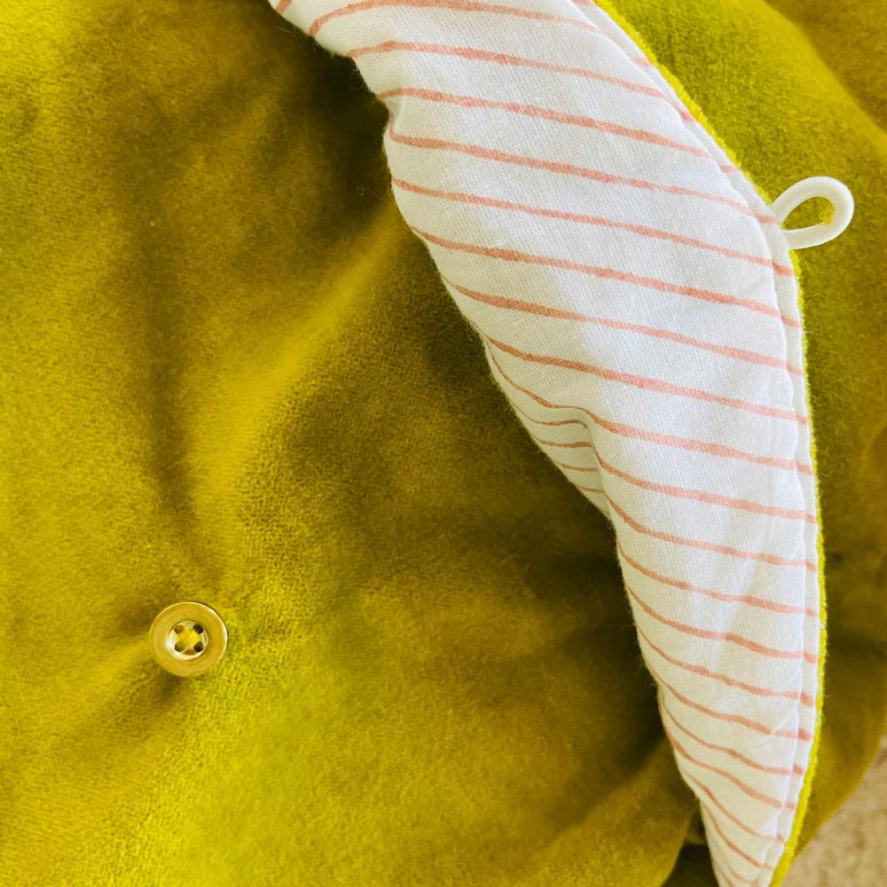 Der Bezug ist wattiert, mit einem bedruckten Baumwollstoff gefüttert und abnehmbar. Wir empfehlen Handwäsche, um den Flausch des Samtes zu erhalten.
