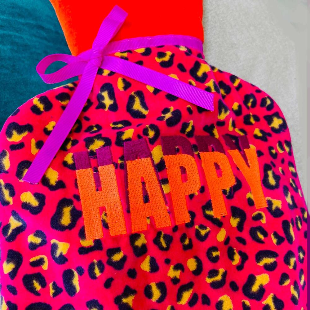Dieses hübsche Exemplar hat einen abnehmbaren Bezug in angesagtem Leo-Druck! Ach und diese Farben- cool! Zusätzlich überzeugt das eine, aber wichtige Wort auf der Vorderseite: HAPPY! Dieses ist so schön bestickt- ein echtes Highlight, das man gerne anschaut.