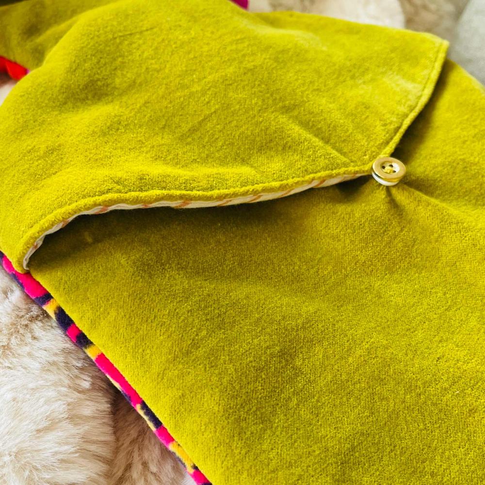 Der Bezug ist rundherum aus weichem Samt hergestellt- ein edles und feines Material, dessen Haptik angenehm ist. Diese Wärmflasche nimmst du gerne in die Hand! Und so wird dieses nützliche Utensil zu einem tollen Deko- Objekt.