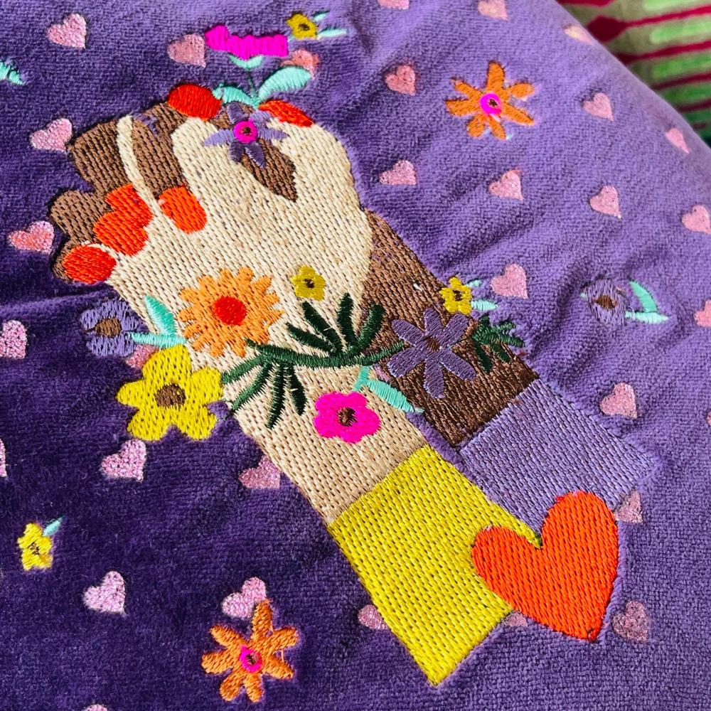 Tolle Farben und eine feine Stickart lassen das Motif erstrahlen, der feine Samtstoff schimmert und wirkt edel.