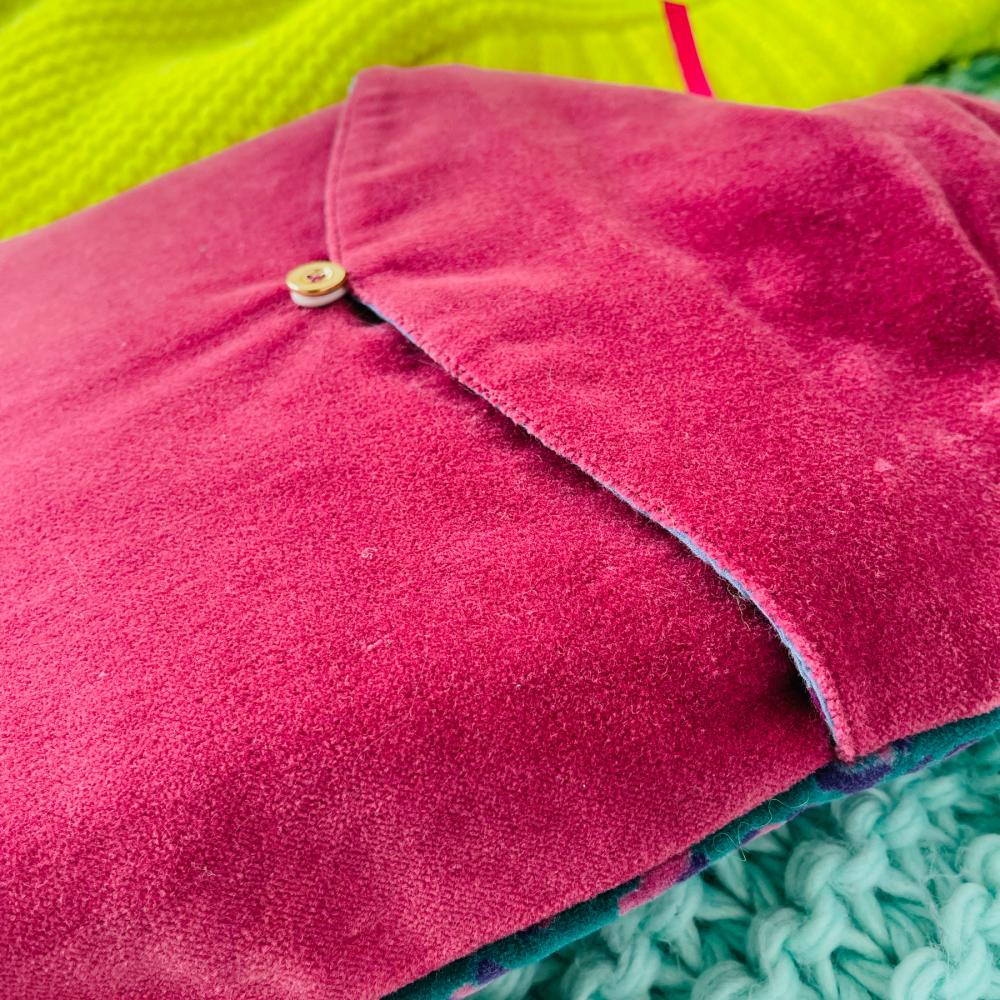 Der Samtbezug ist wattiert, mit einem Baumwollstoff gefüttert und abnehmbar. Wir empfehlen Handwäsche, um den Flausch des Samtes zu erhalten.