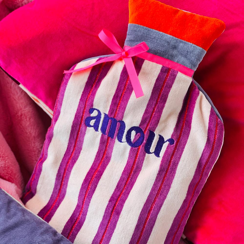 Brrrr- ein kalter Tag! Da wünschen wir uns Entspannung- und eine kuschelweiche Wärmflasche! Dieses hübsche Exemplar ist mit coolen Pinstripes bedruckt und zusätzlich mit einem wunderschönen AMOUR bestickt. Ach wie herrlich, daß man so ein nützliches Accessoire auch als tolles Deko- Objekt für Couch, Sofa oder Sessel nutzen kann!